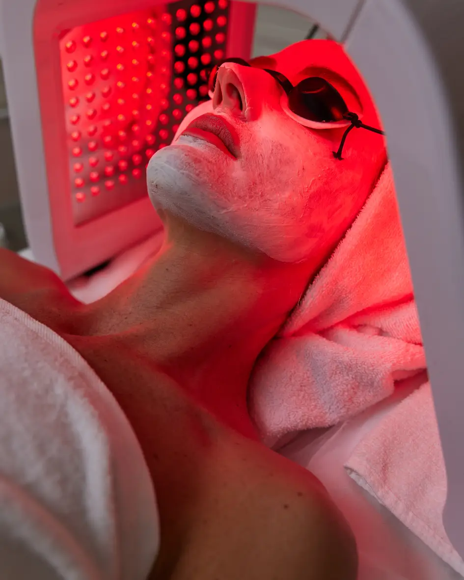 Firms and brightens using antioxidant-rich serums and gentle lifting techniques.